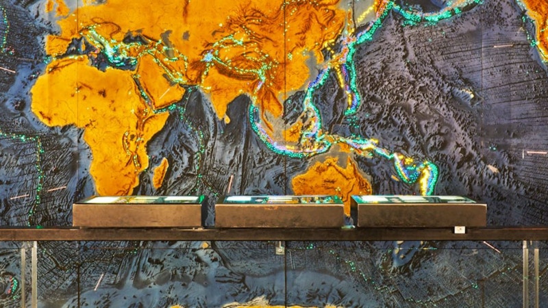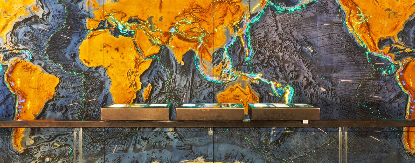 En un gran mapamundi, podrás estudiar las conexiones entre las placas de la corteza terrestre vecinas, los cinturones volcánicos, los terremotos, las cordilleras y las fosas submarinas.