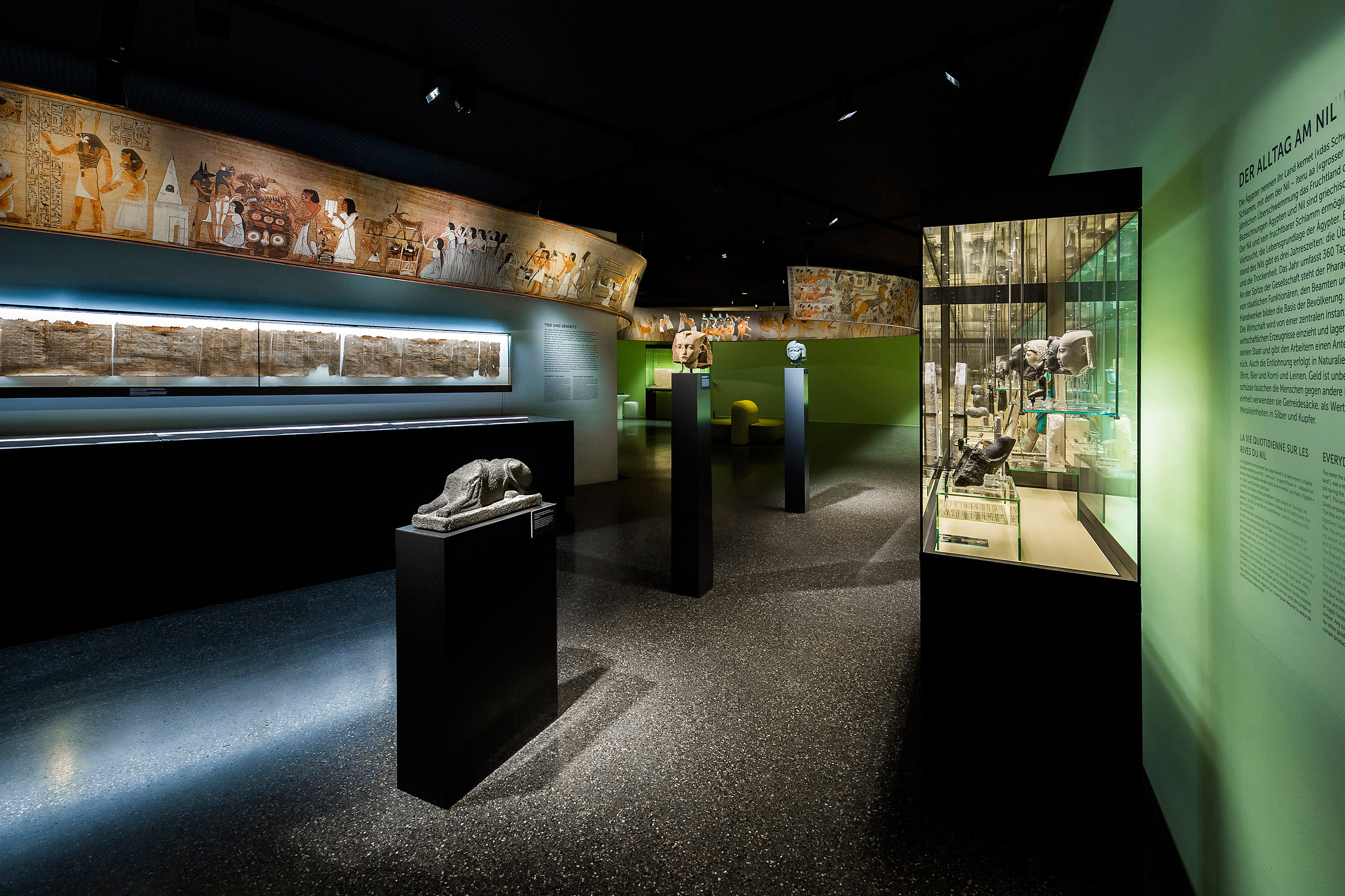 Gracias a las seis áreas temáticas, se garantiza un acercamiento claro, instructivo y apasionante al antiguo Egipto. Los principales protagonistas son los 600 objetos expuestos, que se distinguen por su diversidad, colorido y excelente estado de conservación. En combinación con un diseño de exposición envolvente, los visitantes se sumergen completamente en el mundo pasado pero no olvidado de los antiguos egipcios.