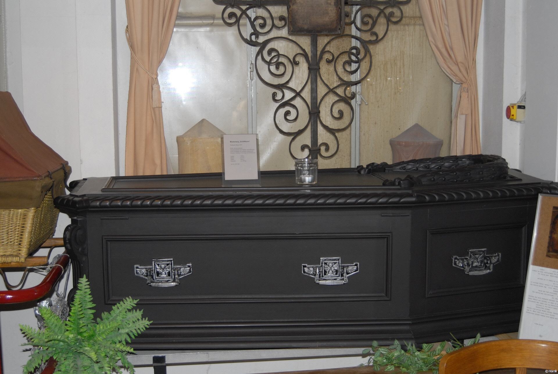 Los visitantes pueden experimentar el carácter y el ambiente del crematorio en el antiguo crematorio del cementerio de Hörnli. La interesante colección sobre la cultura sepulcral y el entierro incluye herramientas, coches fúnebres, urnas de cerámica, piedra, madera o bronce, cruces de hierro forjado, lápidas, coronas de cuentas de vidrio, recuerdos para el cabello y joyas de luto.